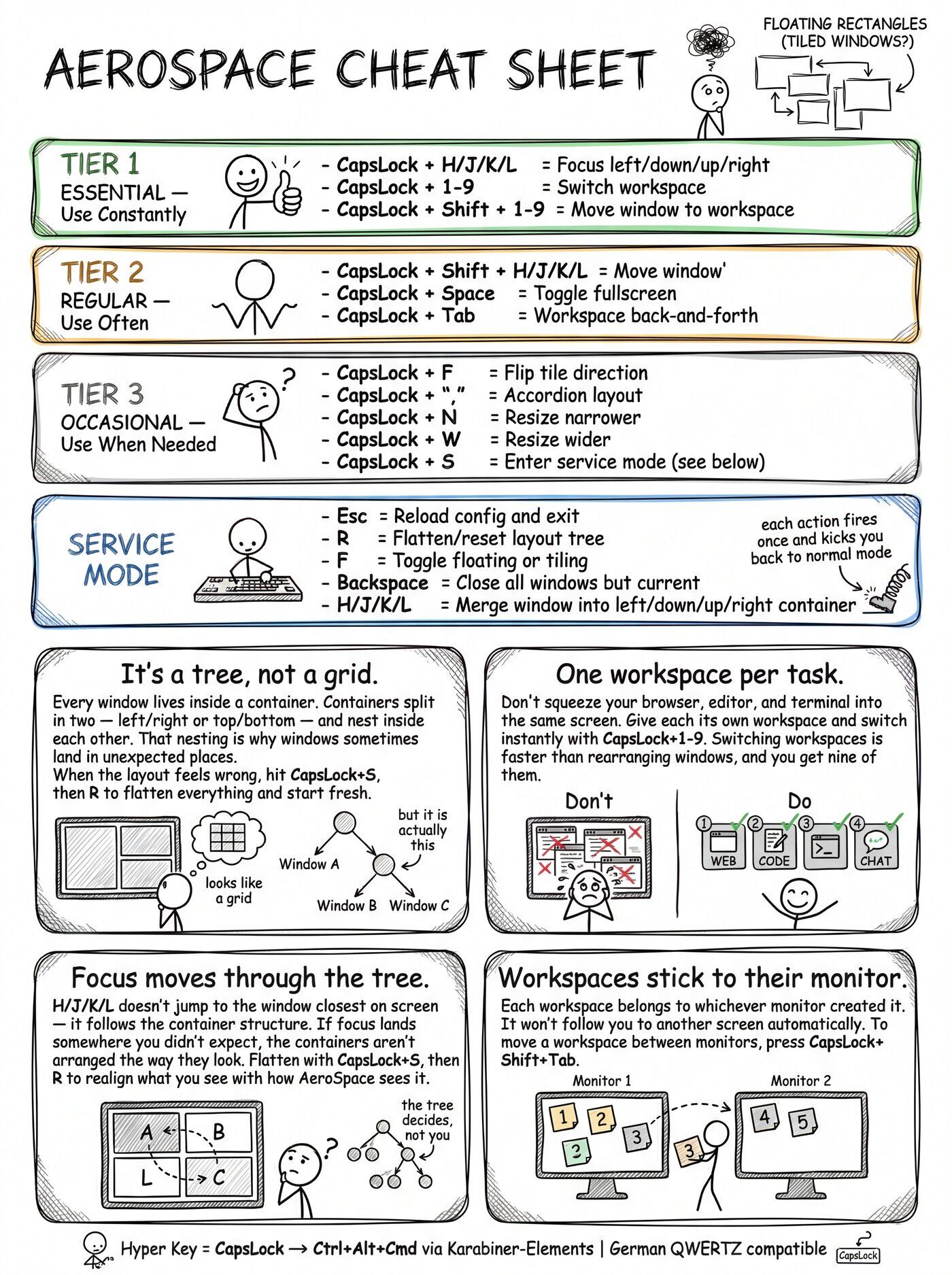 People who've adopted it describe the same arc: a couple of rough days learning the shortcuts, then a week of surprising productivity, then a point where you forget AeroSpace is even running. It's just how the computer works now.